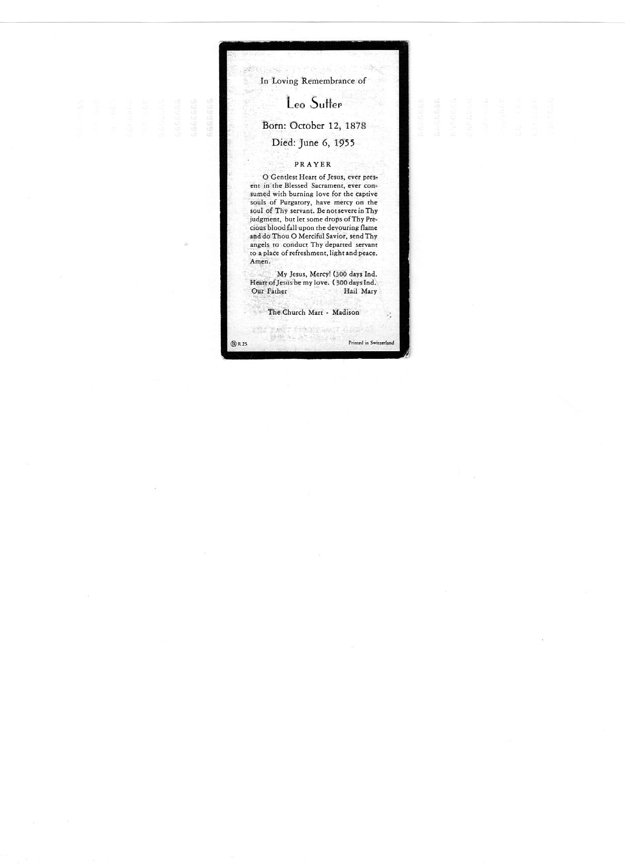 Sutter, Leo, Prayer Card