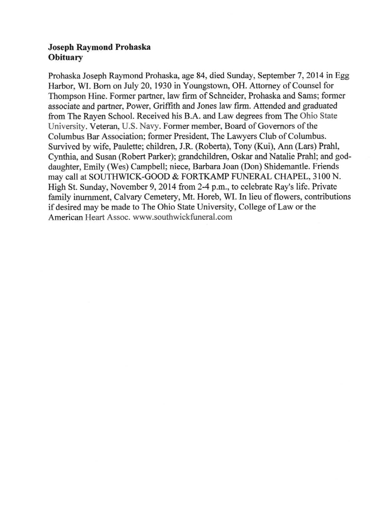 Prohaska, Joseph Raymond, Obit